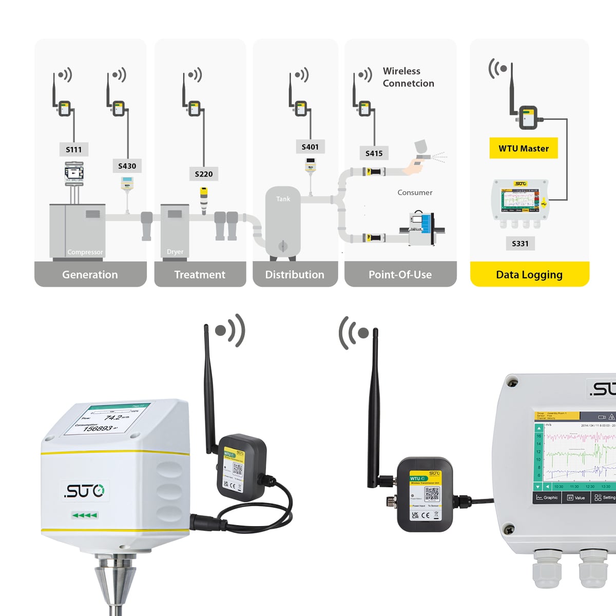 Com suporte multi-sensor por WTU slave, e até 16 dispositivos por master, a WTU assegura uma cobertura completa dos teus pontos de medição.